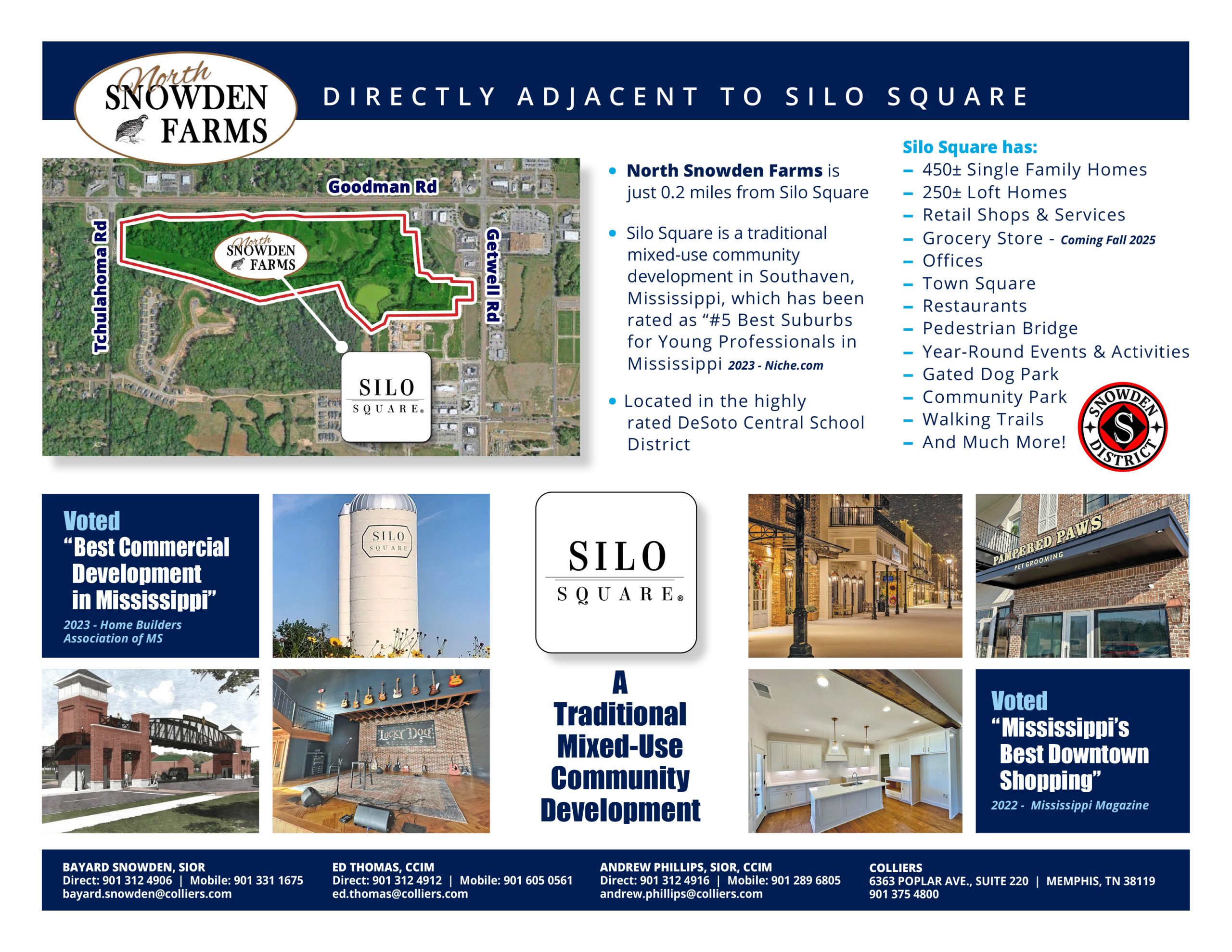Located next to Silo Square and across from Snowden Grove Park, the property sits within three miles of more than 100 major retailers and just minutes from hundreds more. Positioned in Southaven’s most popular and fastest-growing district, Snowden Farms offers exceptional visibility, accessibility, and long-term growth potential within one of the region’s most dynamic markets.